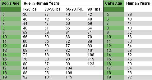 Although we may not like to think of it, aging is part of life, and all of our pets will eventually succumb to it. Because a pet’s life span is so much shorter than yours and mine, an animal can seem like it is aging right before our eyes. The table below will help you determine whether your pet is a senior or geriatric by showing the animal's relative age in human years. Compare your dog's Age and its Weight to determine it's Age in Human Years.