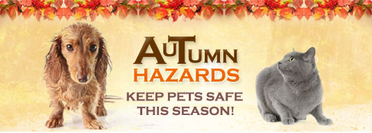 As Fall approaches and the weather begins to change, the same can be said for the needs and behaviors of our pets. As we prepare for a new season, we should make sure that our pets are prepared as well. Below are some hazards to watch out for this Fall. |  |