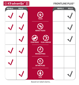 - K9 Advantix II kills and repels mosquitoes which can carry Heartworm disease and West Nile Virus