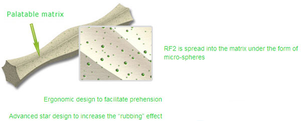 Clenz-A-Dent Dental Sticks formula is enhanced with RF2 and PlaqueOff [purified seaweed extract, Ascophyllum sp.] which breaks down the bio-film made by bacteria present in your dog's mouth. Bio-film is a matrix made by bacteria in which they hide and multiply. the bio-film grows to form dental plaque which in turn gets mineralized into calculus. RF2 fights plaque and calculus where they originate by breaking down and destroying the bio-film. RF2 simultaneously helps restore the mouth's natural bacterial balance preventing bad breath.