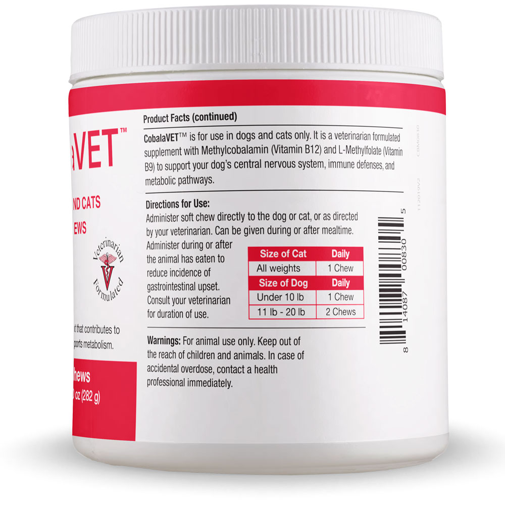 CobalaVet contains cobalamin, which is a crucial vitamin for the proper functioning of the nervous system, the production of red blood cells. CobalaVet soft chews are carefully formulated to meet the specific needs of small dogs and cats, ensuring optimal health and vitality.