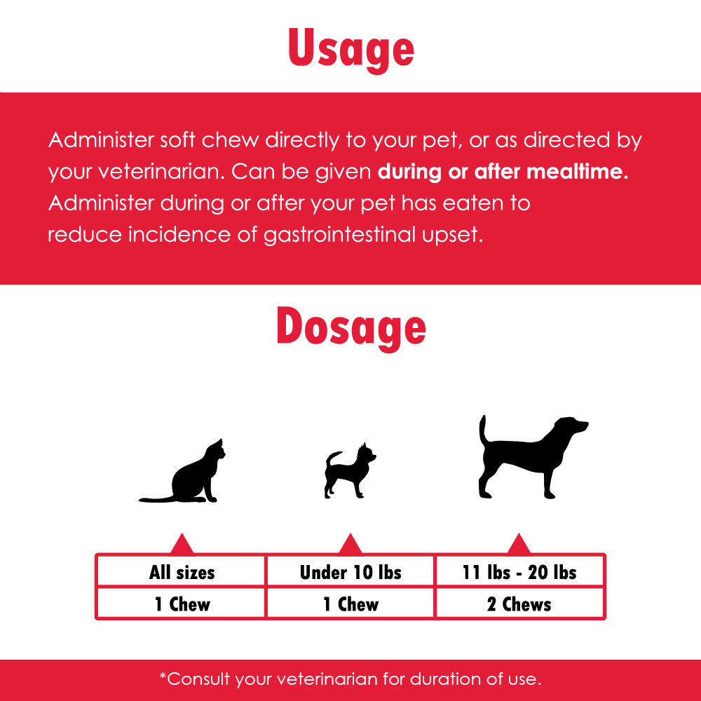 Administer soft chew directly to dog or cat, or as directed by your veterinarian. Can be given during or after mealtime. Administer during or after the animal has eaten to reduce incidence of gastrointestinal upset. Consult your veterinarian for duration of use.