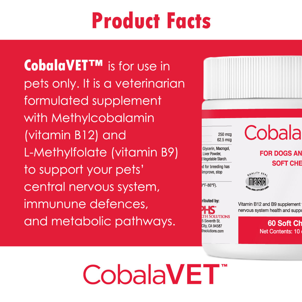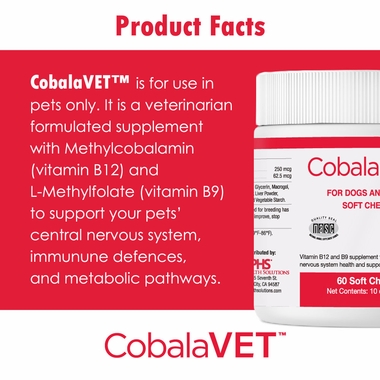 CobalaVet is a veterinary product specifically designed for small dogs and cats. It is formulated to provide cobalamin (vitamin B12), to support overall health and well-being in dogs and cats.