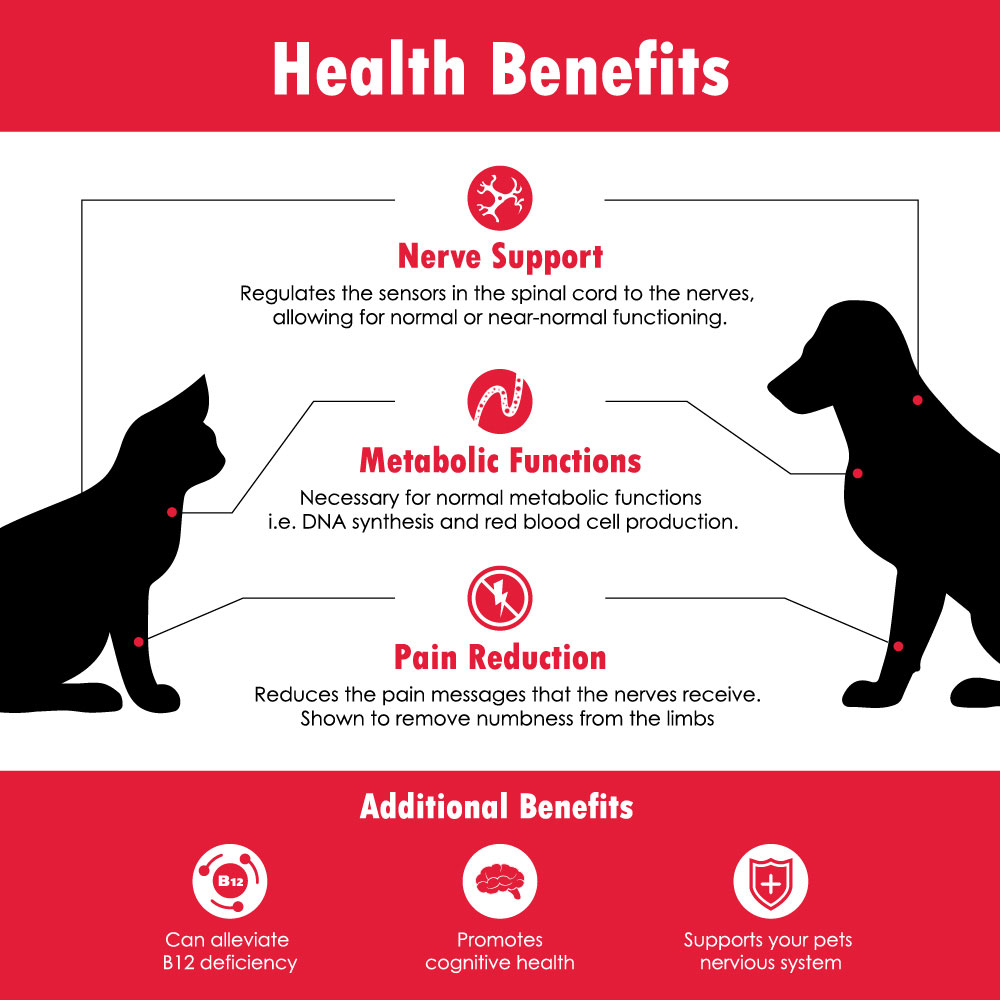 - Promotes Healthy Nervous System: CobalaVet provides an adequate supply of cobalamin, which plays a vital role in maintaining a healthy nervous system in small dogs and cats. It supports nerve function problems that may arise due to cobalamin deficiency.