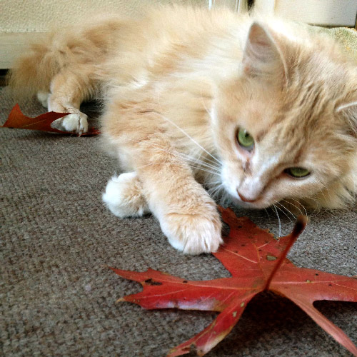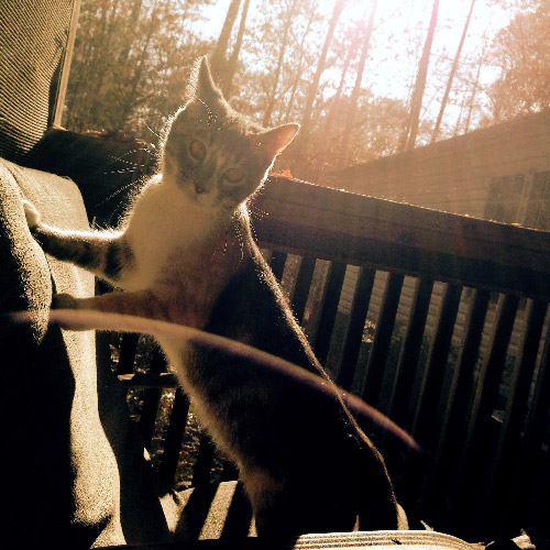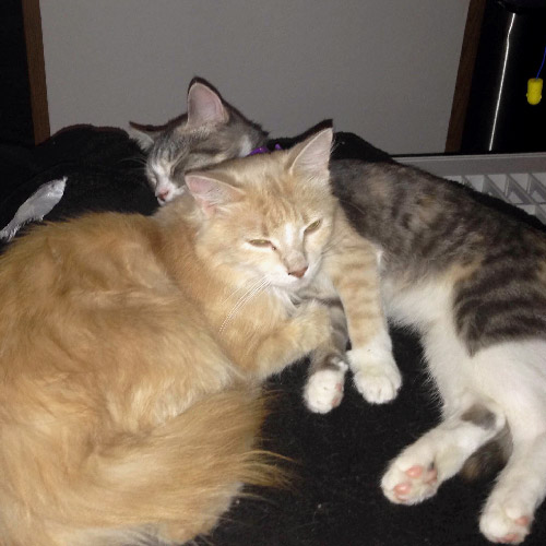 My boyfriend & I were at his parents house outside on a rainy fall day. We heard loud meows and it was a stray cat wanting shelter from the rain. We fed the cat and decided that we would take her home with us. We named her Amber but she prefers to answer to kitty. We didn't expect her to become a part of the family but she did. We've had her over a year now and she is the sweetest cat. She always meows to being called kitty and is more playful than our 9 month old kitten. She is always loving and up for cuddles.