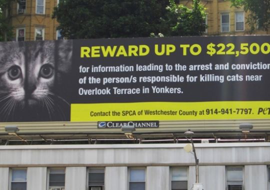 An absurd problem plaguing the citizenry of Yonkers, New York, has met with an unexpected resolution as the alleged culprit behind a series of egregious abuses awaits trial. Over the past five years, more than 60 cats have been found individually wrapped in plastic bags and left hanging from the trees in a local park. The incidents have led to nationwide press and a campaign by PETA offering a $22,500 reward to anyone providing information that leads to the arrest and conviction of the responsible party.