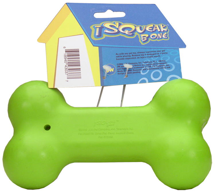 JW Pet Company iSqueak Bone is a vibrant and rugged natural rubber bone infused with vanilla extract that squeaks. This rugged bone comes in assorted colors (red, blue and green)