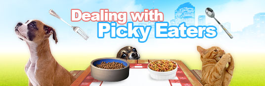 | Changing your pet's food too often can make your pet become a finicky eater. This puts your pet in control of their diet, which can be hazardous to their health. Keeping a steady routine and diet for your pet will help to stabilize their eating habits. | Constant changes in your pets' diets can lead your pet to crave changes and skip repetitive meals. Also, many types of human foods and vegetables that may seem healthy are actually toxic to animals. Before feeding your pet at the table again, read about cat food hazards and dog food hazards. | | | Give your pets treats made for them such as Joint Treats instead of table scraps to prevent them from acquiring a taste for human foods. However, too many treats will spoil your pets appetite. | | | Overfeeding mainly happens with dogs as pets. Owners often praise dogs while eating their food. Dogs are people pleasers and love to be praised, so for them eating is a simple way to be praised. Unfortunately this can lead them to overeating which can make them hesitant to eat. Stick to a schedule and think about the size of your pet before portioning out food. | Pets are animals. They will scavenge for food, even if that means stealing it right off your table. While you are training your pet to eat their own food, make sure that they aren't eating from the table, garbage can or your visitors! | | | Get your pet to eat out of their indicated bowls. Ourpet's Big Dog Feeder provides the optimum feeding height for your pet making it more comfortable for them to feed. It is almost as if you're feeding them out of your hand. | | | | |