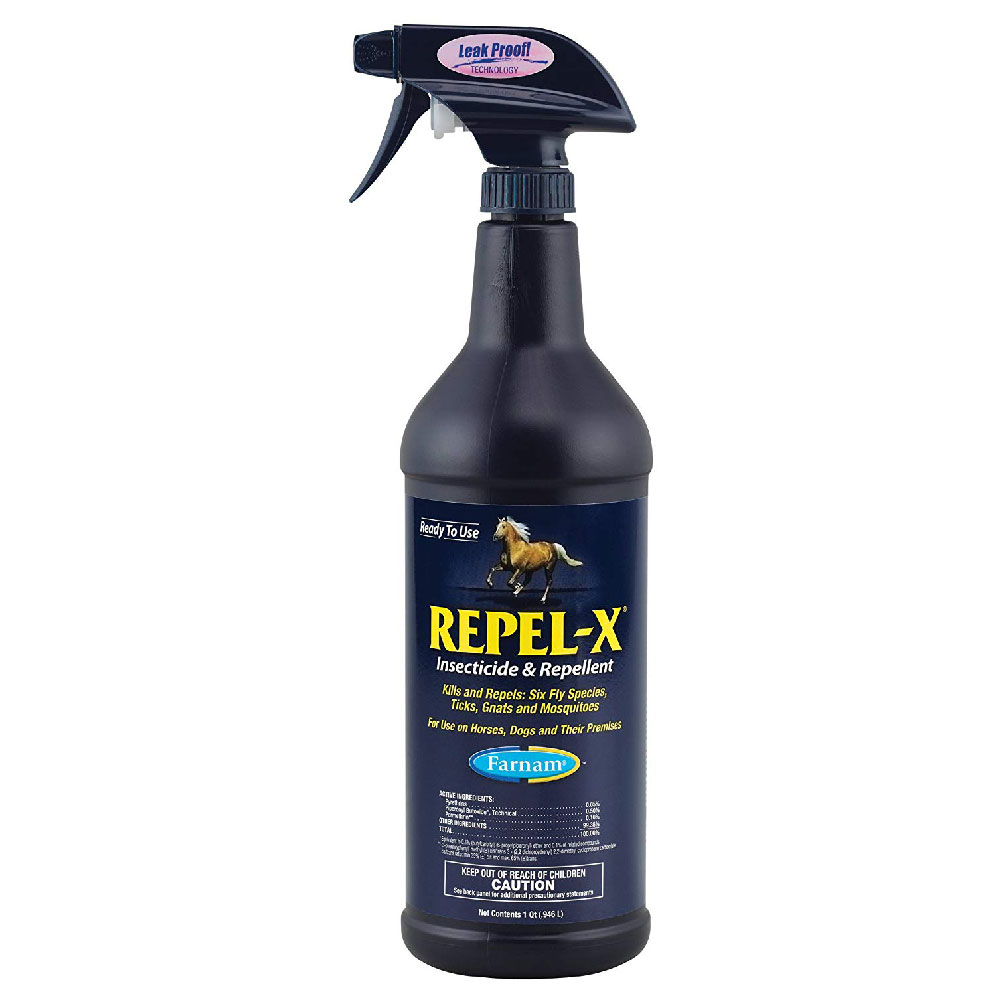 Farnam Repel-X Horse Insecticide & Repellent. This water-based formula protects against stable, horse, face, deer, house and horn flies, mosquitoes, gnats, ticks, fleas, chiggers and lice. This easy-to-use spray can be applied directly to the coat, or the premise to keep insects out of the vicinity. Repel-X is great for horses, but gentle enough to work on dogs, too! To apply, simply spray onto your pet, or onto a clean, absorbent cloth towel and wipe the body to insure adequate coverage.